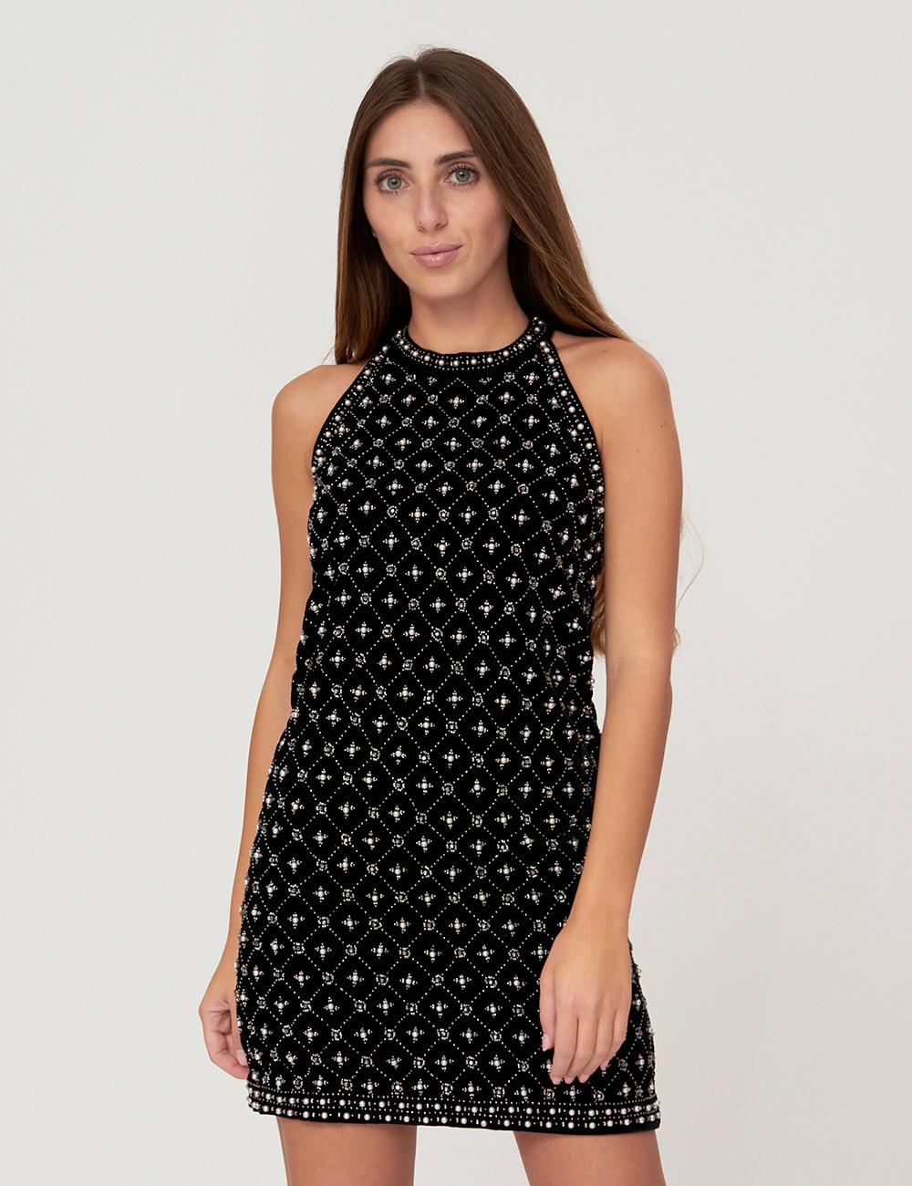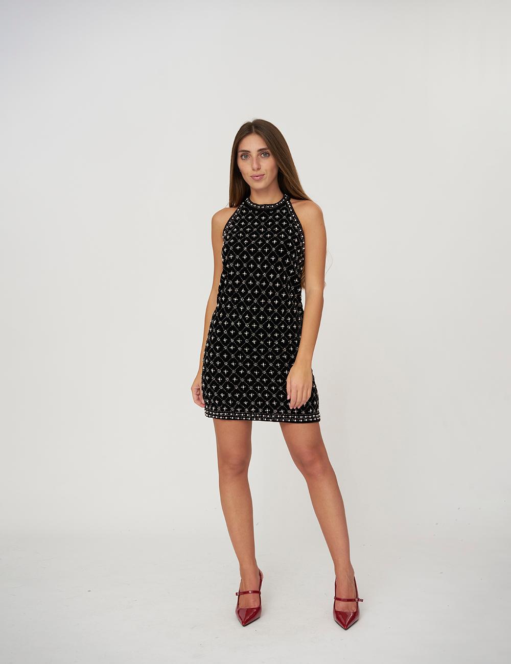 Abito corto in velluto panné ricamato a mano con perline e perle color naturale dal disegno geometrico