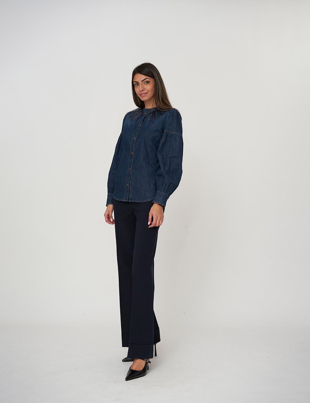 Camicia in jeans scuro con dettaglio di piume rimovibili in tono