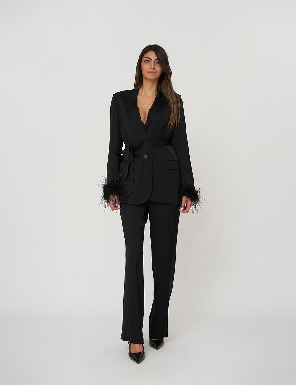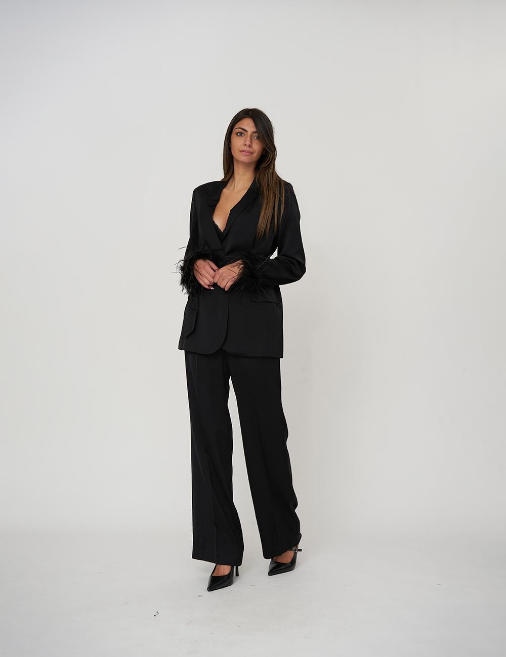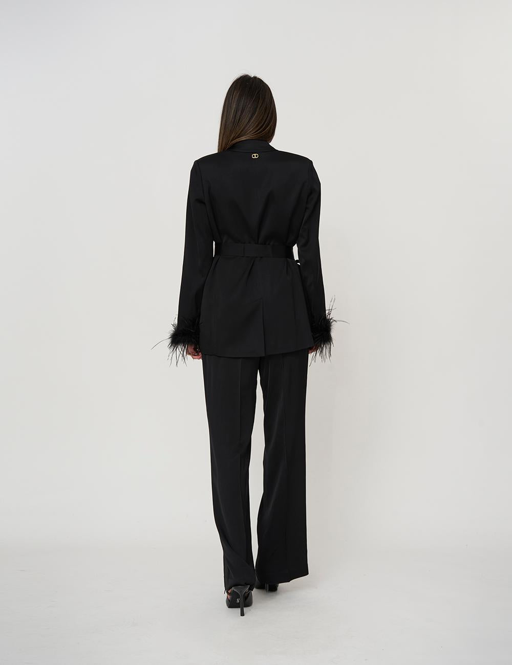 Giacca blazer in raso di viscosa con polsi rifiniti da torchon di piume in tono rimovibili