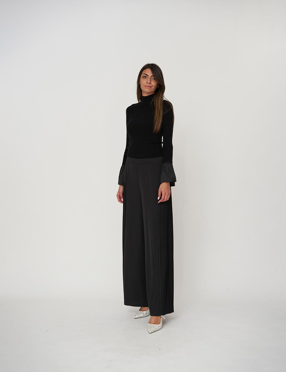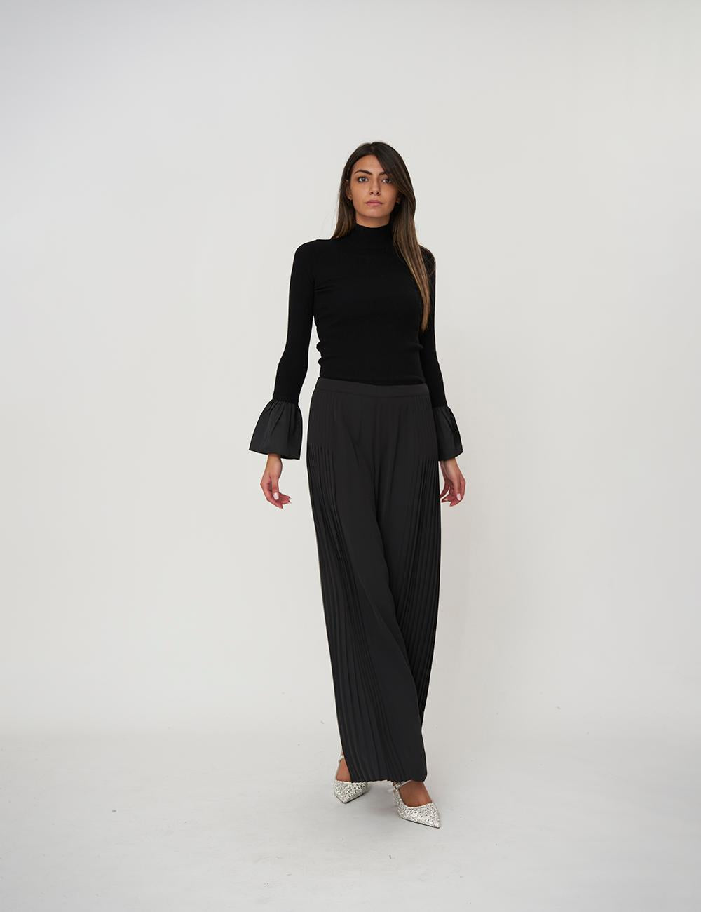 Maniche lunghe con polsi ampi a volant in satin, logo Oval T in metallo sul retro