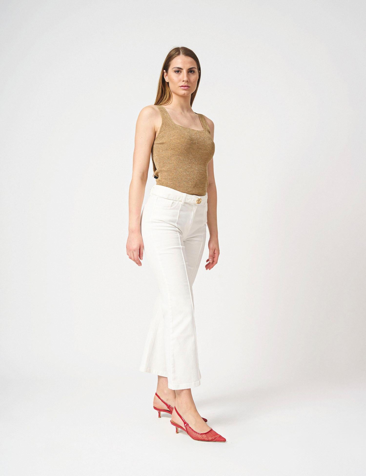 Top smanicato in maglia di misto lino e lurex a coste